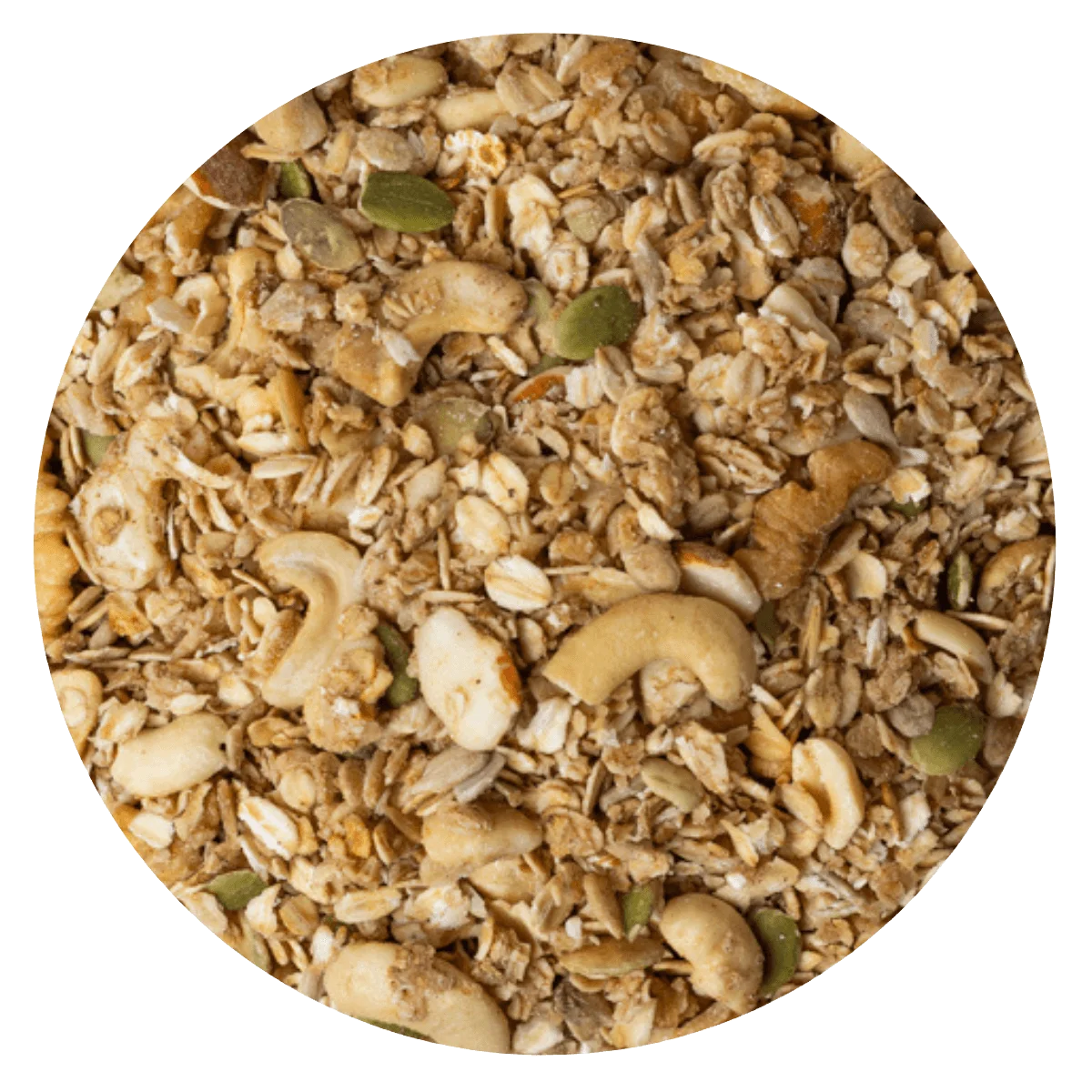 NUEZ – ALMENDRA – CASTAÑA CAJU – MANI SIN SAL- COPO AVENA HORNEADA – SEMILLA GIRASOL – SEMILLA ZAPALLO – MIEL – ESENCIA VAINILLA – ACEITE COCO – CANELA