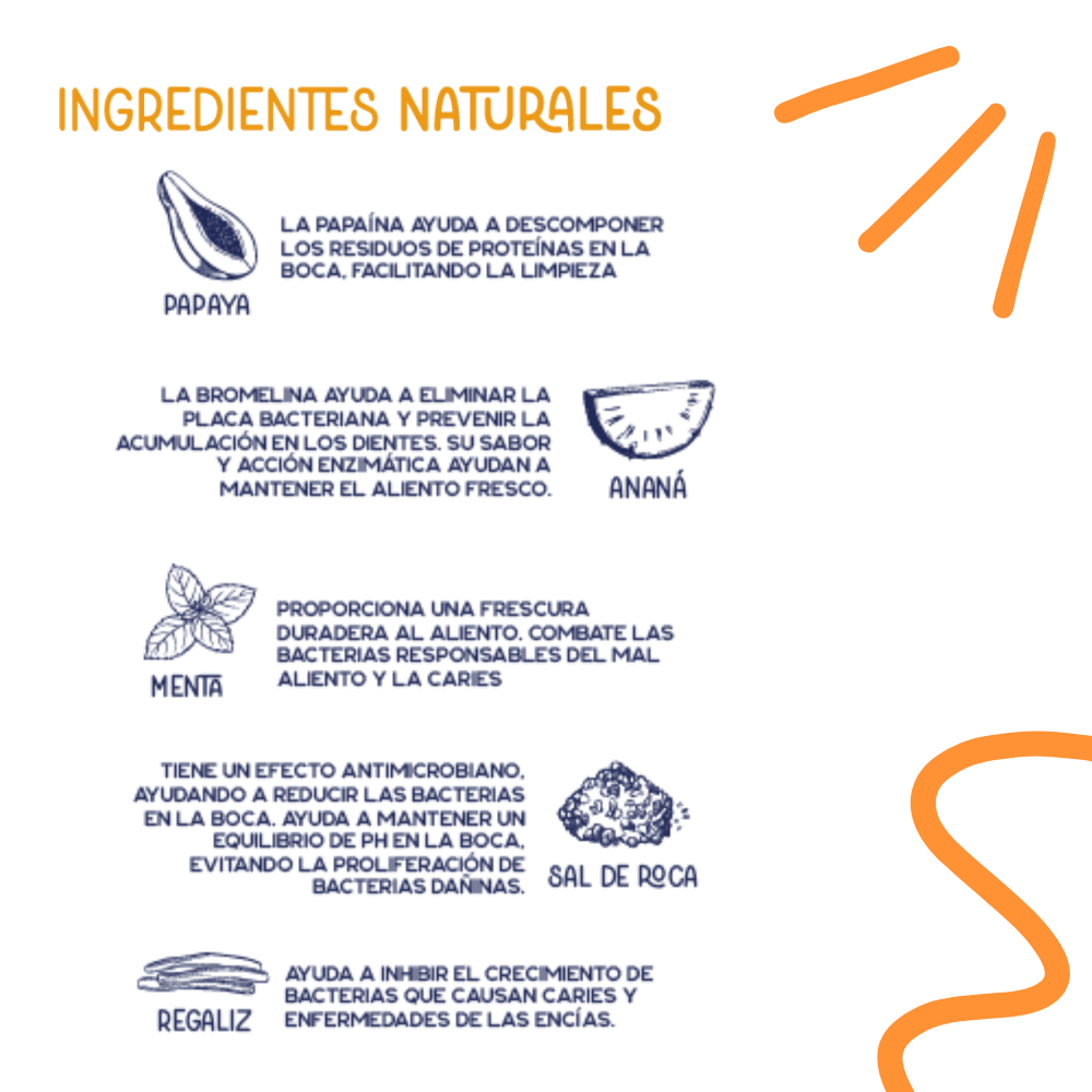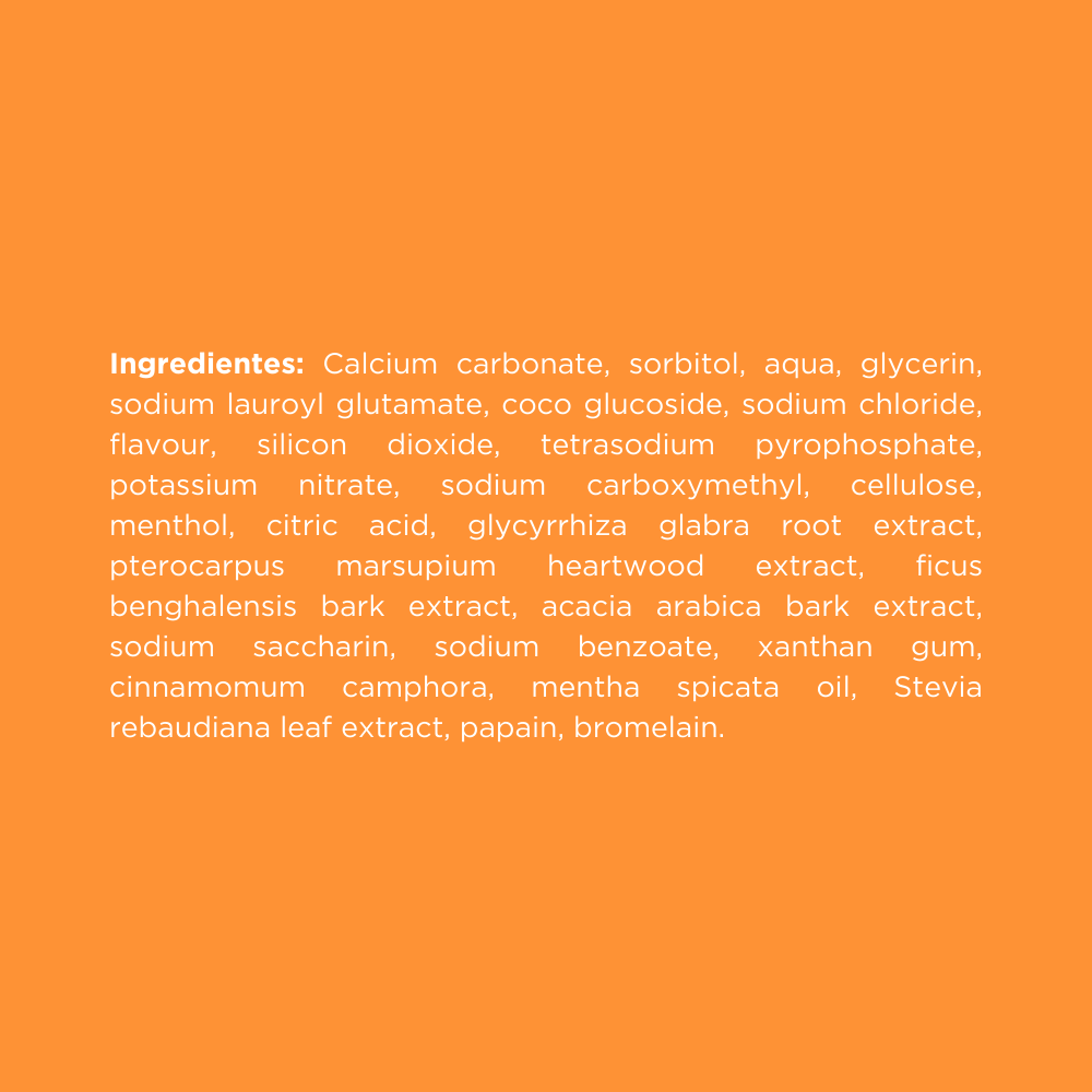 Menta: Proporciona una frescura duradera al aliento. Combate las bacterias responsables del mal aliento y la caries.