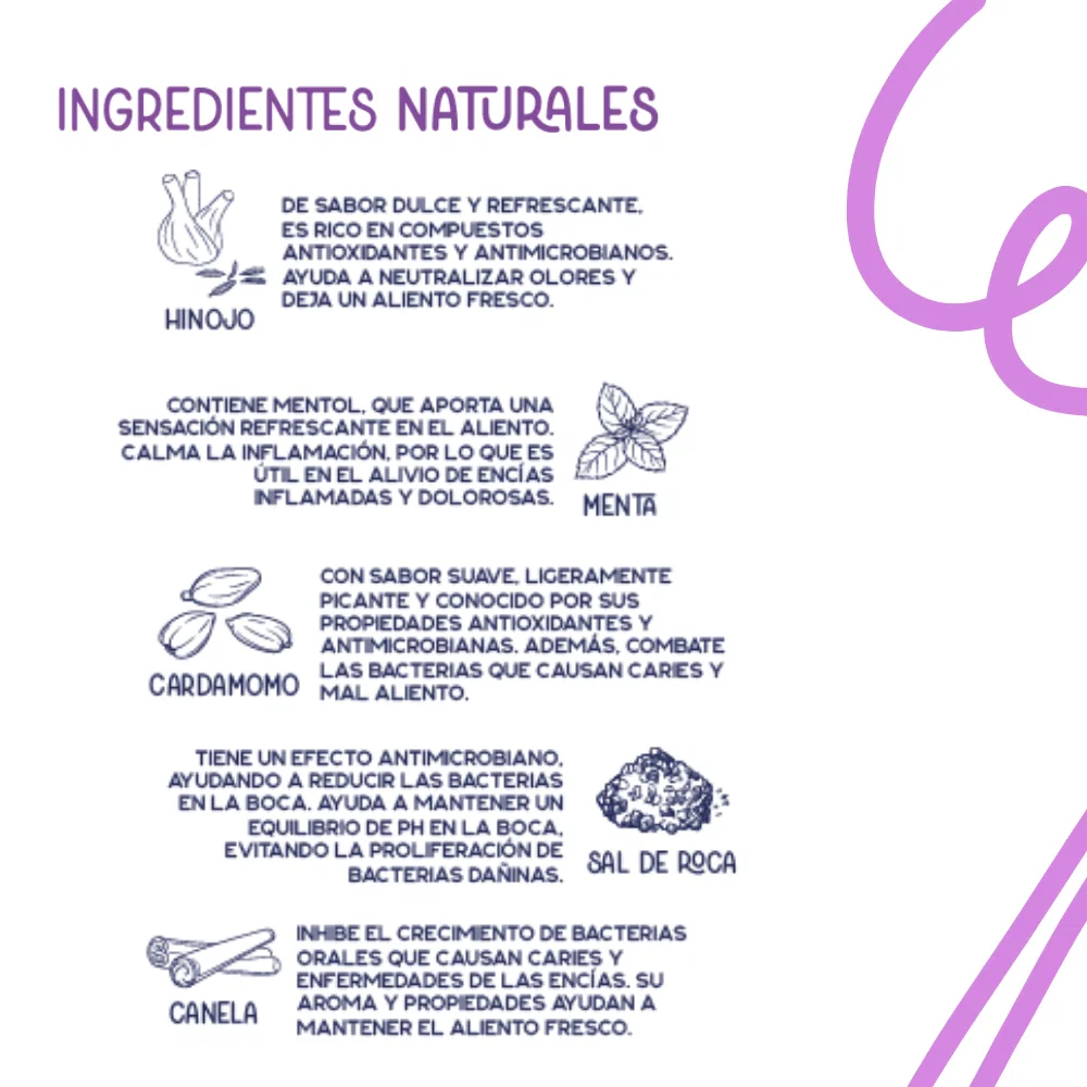 Hinojo: tiene un sabor dulce y refrescante y es rico en compuestos antioxidantes y antimicrobianos. Su sabor refrescante ayuda a neutralizar olores y deja un aliento fresco.