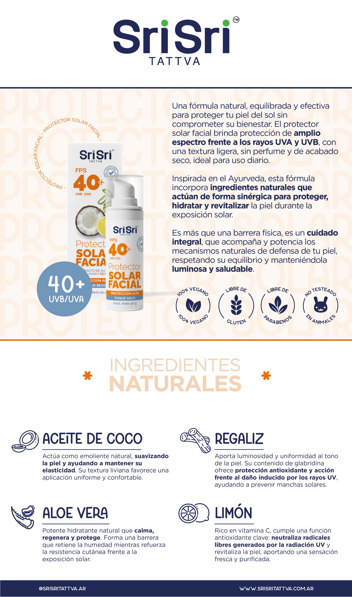 Una fórmula natural, equilibrada y efectiva para proteger tu piel del sol sin comprometer su bienestar. Este protector solar facial ayurvédico FPS 40+ brinda protección de amplio espectro frente a los rayos UVA y UVB, con una textura ligera, sin perfume y de acabado seco, ideal para uso diario.